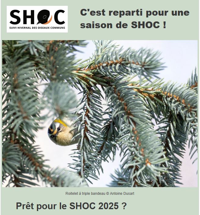 L'hiver arrive à grands pas et le Suivi hivernal des oiseaux communs (SHOC) également. Pour cette nouvelle saison, nous faisons appel à votre mobilisation pour la réalisation des 2 passages hivernaux :