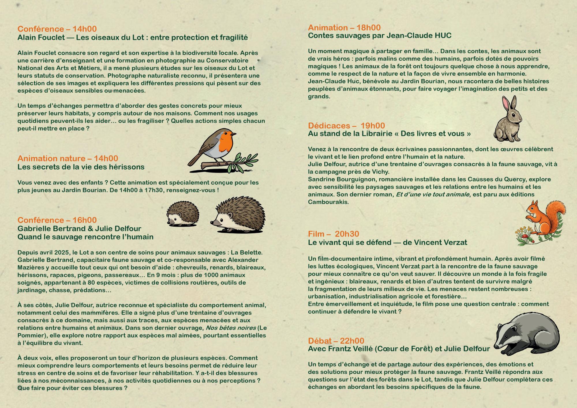 Conçue en concertation avec la LPO Occitanie, délégation du Lot, également présente avec un stand, cette Journée Faune met en lumière celles et ceux qui s’engagent pour le vivant. Fil rouge original de l’événement : l’artiste et paysagiste Alice Freytet réalisera un compte-rendu dessiné sur le vif, capturant en images les temps forts de la journée.