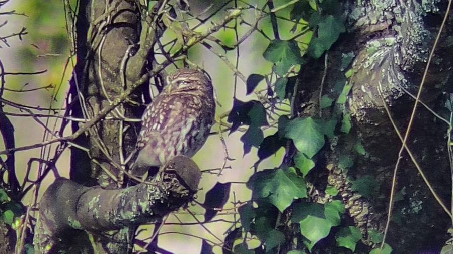 Après quelques mots de présentation sur l’espèce nous sommes partis pour un petit parcours autour de la commune pour découvrir le biotope favorable et les nichoirs mis en place. Nos petites chouettes avaient semble-t-il décidé de rester bien à l’abri des regards mais une prospection minutieuse de leurs reposoirs habituels à permis de découvrir un individu sur une branche de noyer.