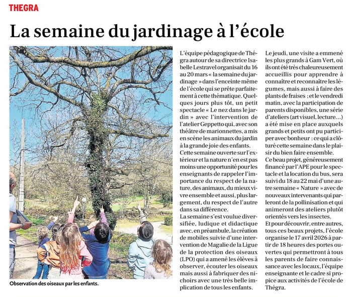 À Thégra, dans le cadre d’un projet pédagogique annuel axé sur le potager, les enfants de maternelle et de CP sont sensibilisés aux différentes espèces que l’on peut y observer. Des animations ont déjà été réalisés sur les oiseaux et le Hérisson. Une animation sur les petites bêtes du potager sera réalisée au mois de mai. D'autres interventions sont prévues pour les enfants dans le cadre de ce riche projet mené par les enseignantes.